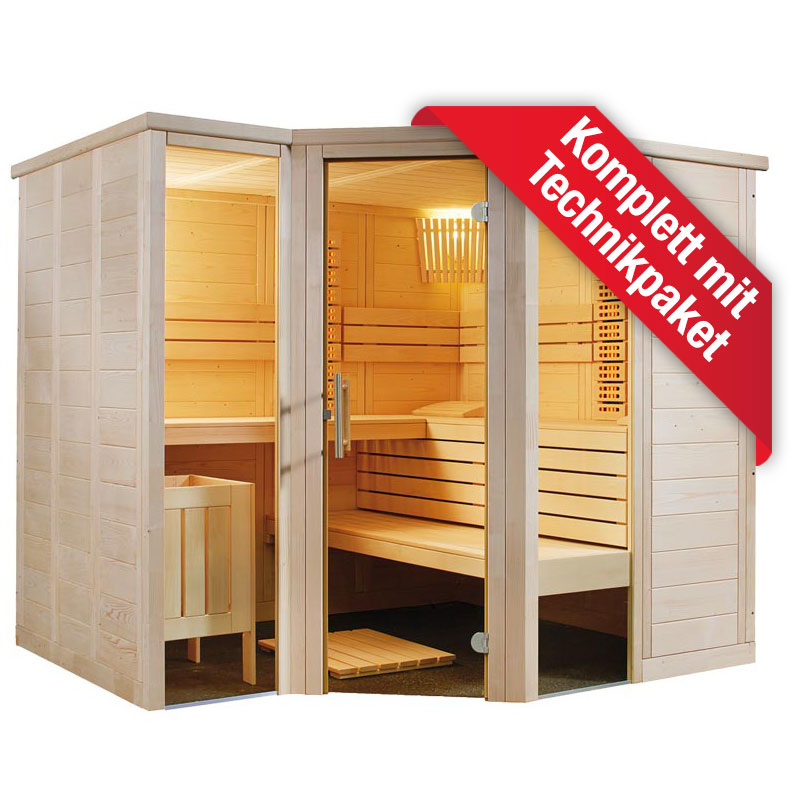 Incl. Sauna-Technikpaket "Finntrend Edition" für klassische Finnische Sauna oder "Combitrend" für Bio-Klimasauna mit Verdampfer.