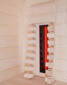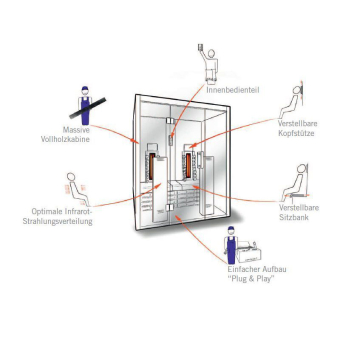 Die gesamte Technik lässt sich dank der patentierten Innenbedienteile mühelos vom Sitzplatz aus bedienen. Der einfache Aufbau aus vorgefertigten Elementen ermöglicht einen schnellen Genuss der Infrarotwärme mit einer vollausgestattete Infrarotkabine in den eigenen vier Wänden.