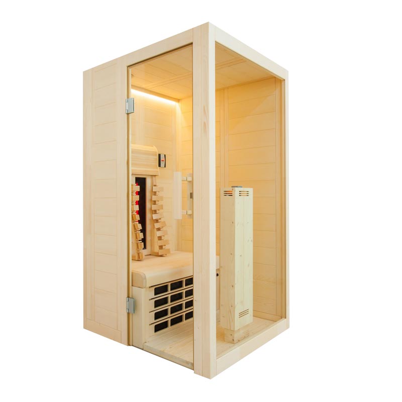 MiniMy 120 Vollspektrum Infrarot Wärmekabine aus Massivholz mit Glasfront und modernster Technik-Ausstattung.