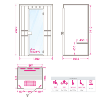 Die DUO-Strahler beinhalten jeweils einen Quarz-Vollspecktrumstrahler und einen Magnesiumoxydstrahler in einem hochwertigen Reflektor. Hierdurch wird die Wärmeentwicklung zum Körper weich und gestreut abgegeben. Die Strahler sind einzeln aus- und umschaltbar.