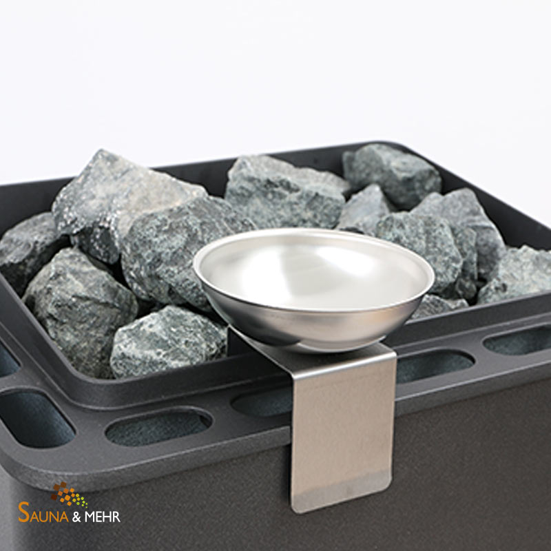 Innovatives Zubehör zum nachrüsten von finnischen Saunaöfen mit Verdampferschale. Edelstahlschale für Kräuter, Essezen, ätherische Öle.