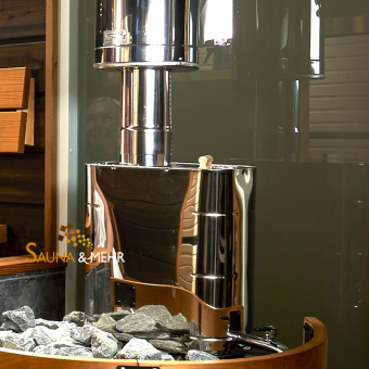Dieser Warmwasserbehälter, mit 22 Ltr. Inhalt, ist für den Schornsteineinbau vorgesehen und wird direkt am Rauchrohrstutzen des Saunaofens montiert. Das Wasser erwärmt sich schnell durch den Rauchabzug der direkt durch den Wasserbehälter führt.