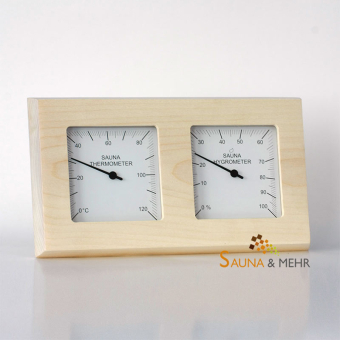 Eine elegante Klimastation für Ihre Heimsauna. Modernes kantiges und quadratisches Design. Gut ablesbare Skalen für Temperatur und Luftfeuchtigkeit.