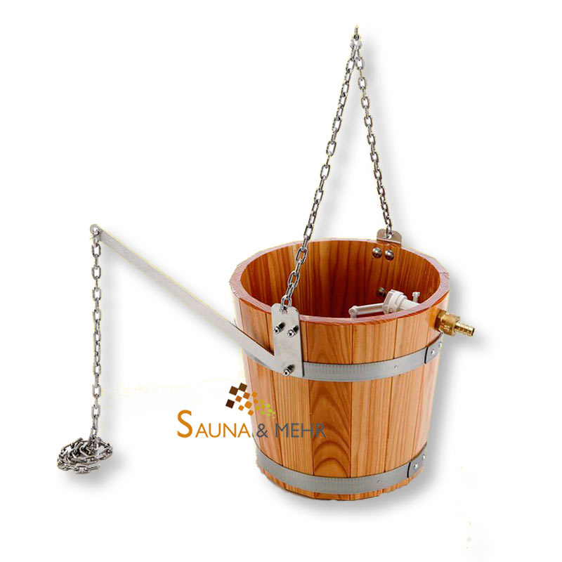 Schwalleimer für Schwalldusche mit Festwasseranschluss und Haltekette für Deckenmontage.
