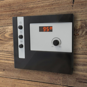 Elektronisches Steuergerät für die Finnische (trockene) Sauna. Mit 24-Std.-Vorwahlfunktion und Temperaturanzeige.