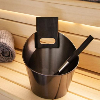 Der Harvia Sauna-Aufgußkübel in "Black Steel" Schwarz und passender Schöpfkelle aus Edelstahl verleiht Ihrem stilvollen Einrichtungskonzept das gewisse Etwas.