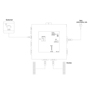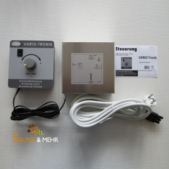 Einfach zu bedienende Steuerung für Infrarotstrahler mit Bedienteil in der Sauna. Das Leistungsteil wird ausserhalb der Sauna montiert, das Bedienteil mit Ein-/Ausschalter und Intensitätsregler kann zur bequemen Bedinung innerhalb der Saunakabine montiert werden.