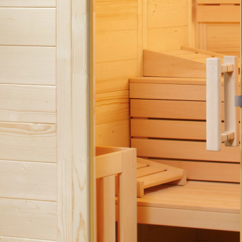 wood.LINE Trend - unsere preisgünstige Massivholz Sauna, Blockbohlen aus nord. Fichtenholz prägen neben der Glastür und der hochwertigen Komfort Inneneinrichtung mit 62 cm tiefen Bänken den überaus soliden Eindruck dieses Modells.